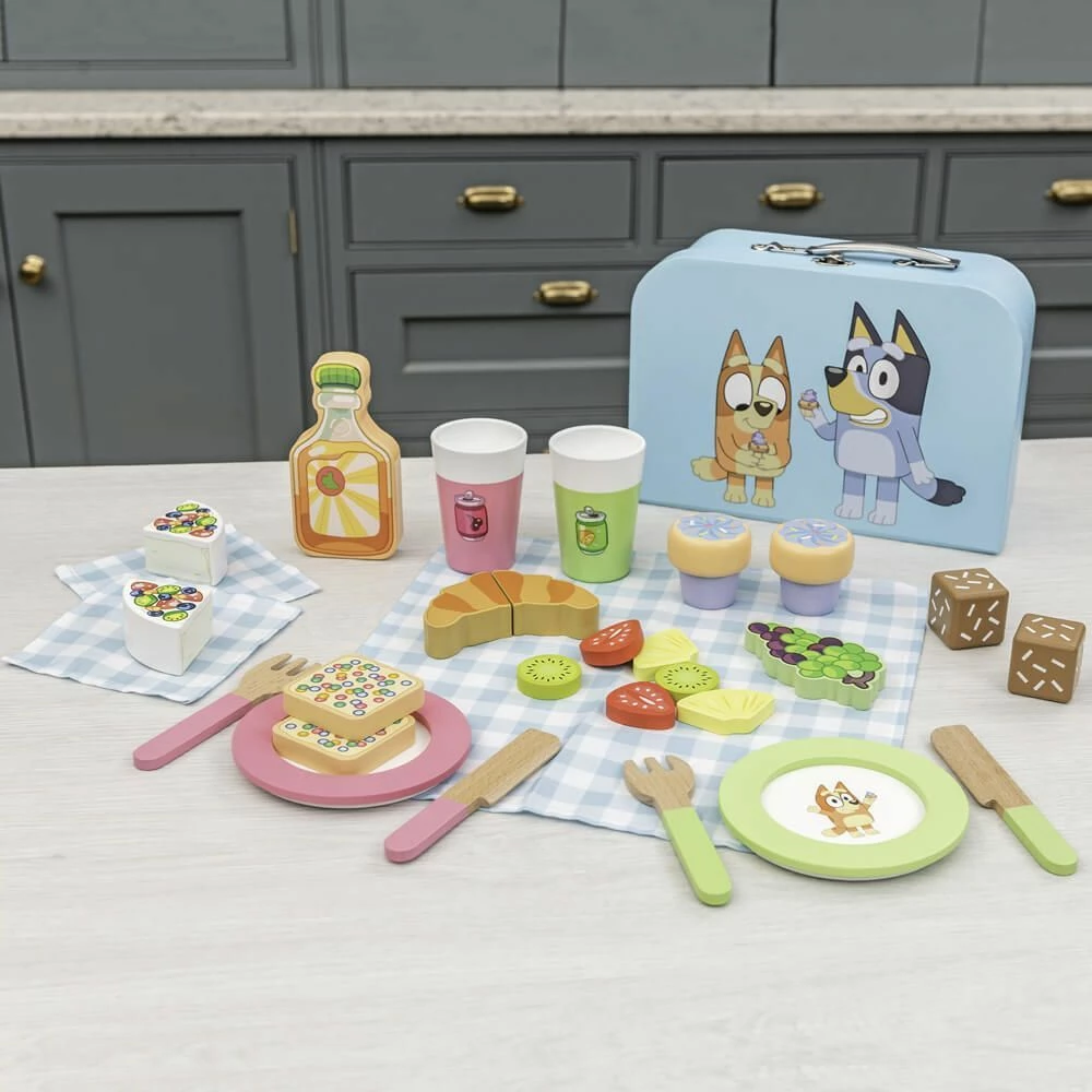 Even on rainy days, picnic time will never be over with this Bluey Wooden Picnic Set. Cake, croissants, fruit, sandwiches and more are included in this roleplay set, which can all be plated up alongside the Bluey cutlery. For on-the-go play, pack all the accessories into the Bluey branded Carry Case to store away for another day of pretend play! The Bluey Picnic Set is made from responsibly sourced materials, the wooden products are certified by the FSC.