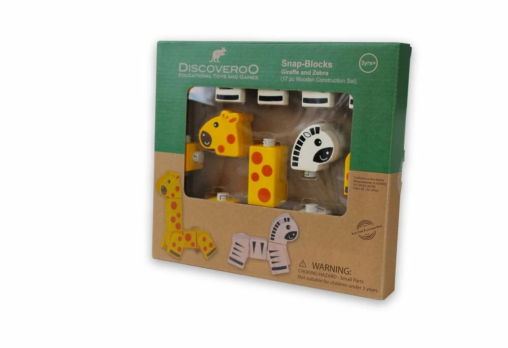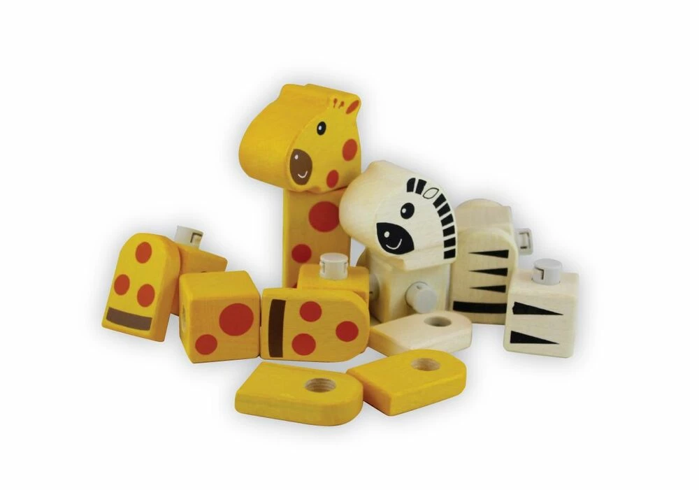 A 17 piece wooden construction set. This set includes blocks that snap together to make a Giraffe and a Zebra. The animals have moving limbs for hours of open ended play.